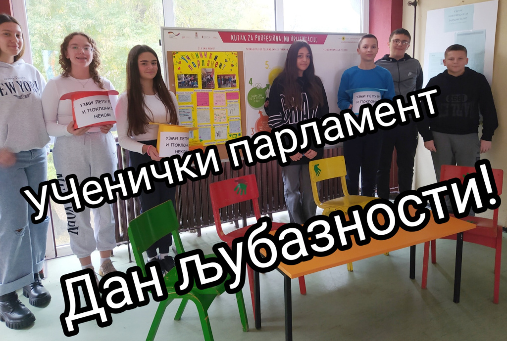 Ученички парламент је данас обележио Дан љубазности активношћу: Узми лепу реч и поклони је неком. Обишли су све учионице, сваки ученик је извукао листић - лепу реч коју је могао да поклони неком другу/другарицу.