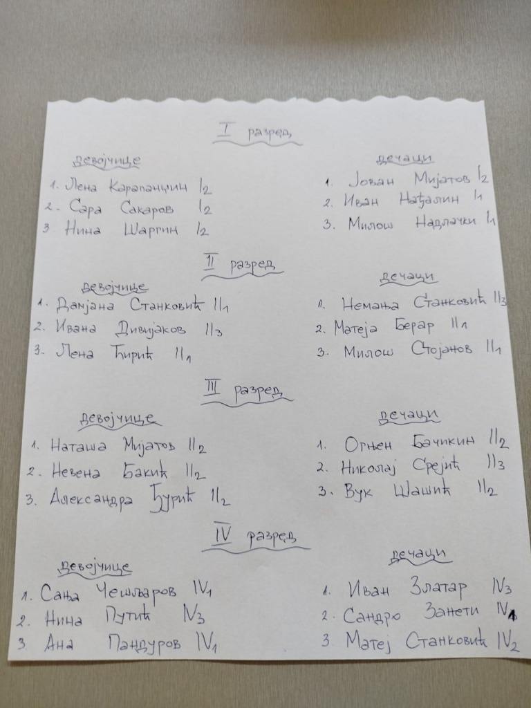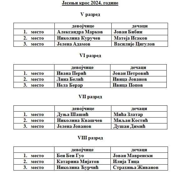 Наши ученици су остварили запажене резултате у свом узрасту, један од најбољих резултата остварила је Вања Бибин 1. место. Ученици су добили тркачке медаље, разне поклоне и понели лепе утиске са ове манифестације.