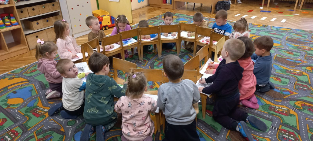 >И најмлађи су са васпитачицама Горданом и Дајаном учили прве кораке толеранције тако што су учествовали у ликовној радионици " музичке столице".