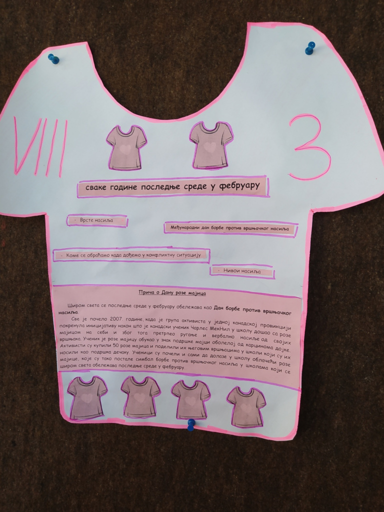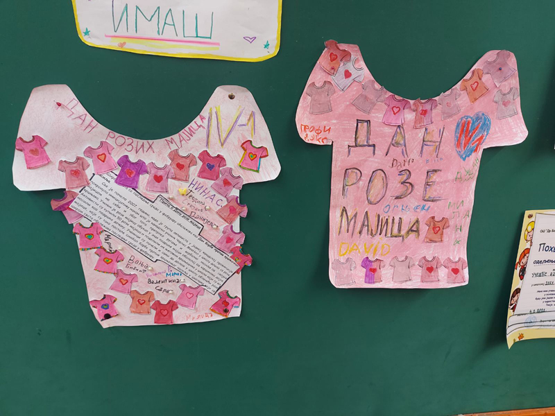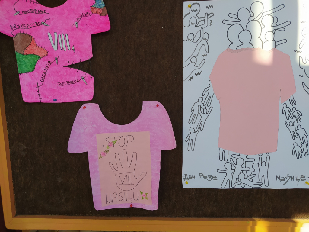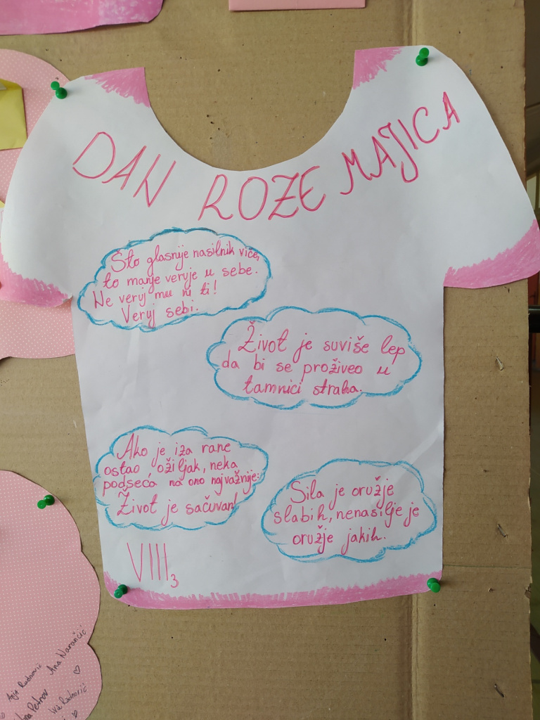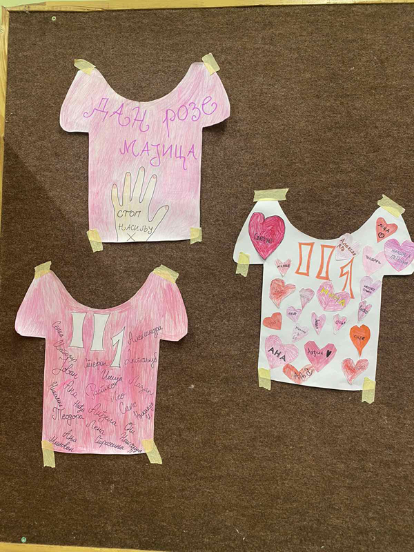 Ове школске године ,Дан розе мајица - Међународни дан борбе против вршњачког насиља смо обележили 23. фебруара различитим активностима: разговорима о свим врстама вршњачког насиља, прављењем плаката, паноа, гледањем филмића о вршњачком насиљу, визуелним представљањем, поделом „ беџеве - розе мајице“. У петак, 25. фебруара нас очекује трибина: Отворено о вршњачком насиљу.