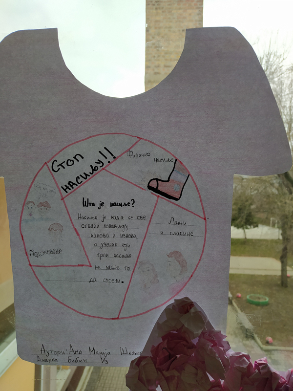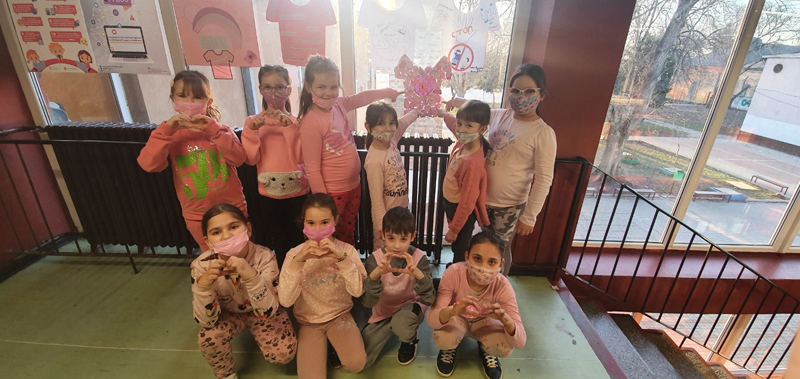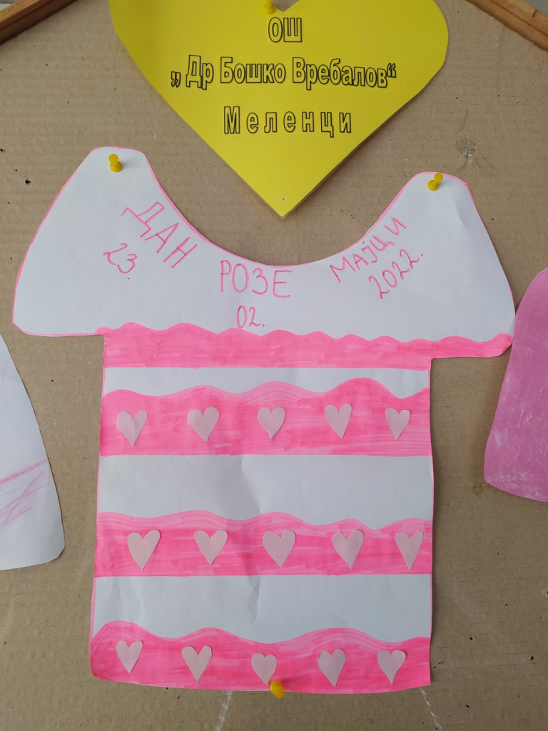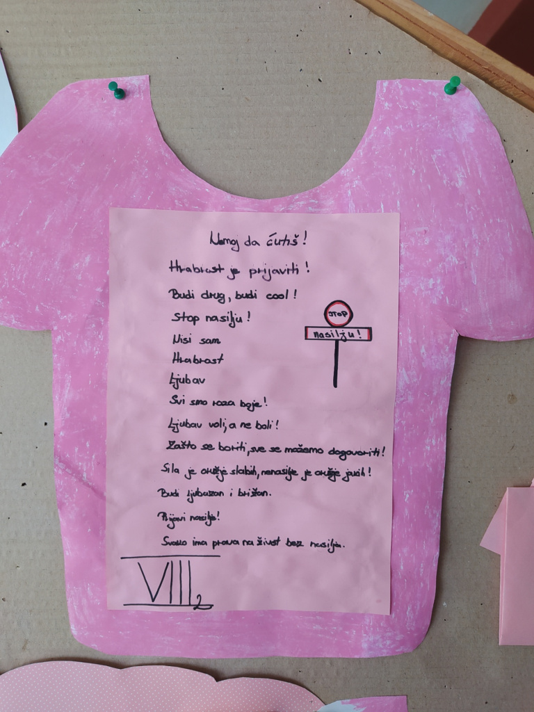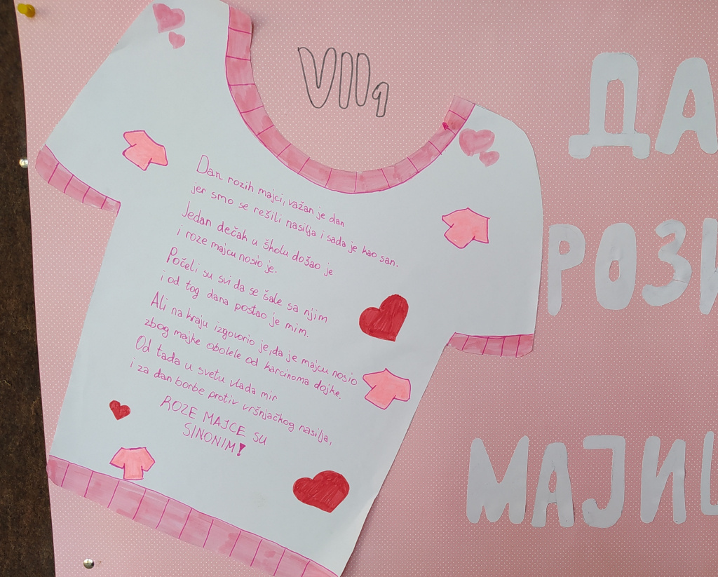 Ове школске године ,Дан розе мајица - Међународни дан борбе против вршњачког насиља смо обележили 23. фебруара различитим активностима: разговорима о свим врстама вршњачког насиља, прављењем плаката, паноа, гледањем филмића о вршњачком насиљу, визуелним представљањем, поделом „ беџеве - розе мајице“. У петак, 25. фебруара нас очекује трибина: Отворено о вршњачком насиљу.