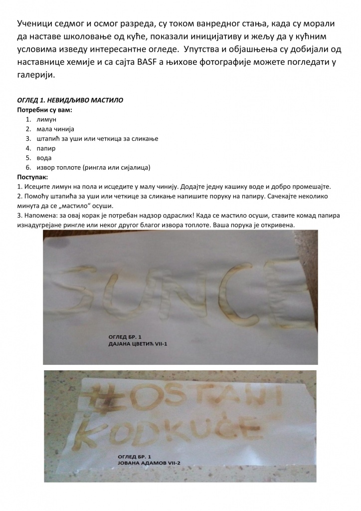 Ученици седмог и осмог разреда, су током ванредног стања, када су морали да наставе школовање од куће, показали иницијативу и жељу да у кућним условима изведу интересантне огледе. Упутства и објашњења су добијали од наставнице хемије и са сајта BASF, а шта су све радили можете погледати у прилогу.
