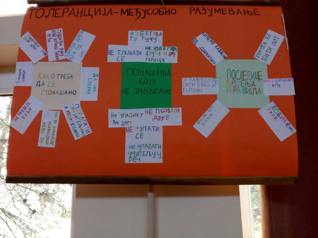 Вредне девојчице су спремиле песму " Не ругај се",  ученици 6., 7. и 8. разреда од чепова су исписали реч толеранција, представници Ученичког парламента су направили и поделили флајере, ученици 3. разреда направили плакате, а и други ученици су са наставницима разговарали на ову тему, и у току недеље ће можда бити још креативних радова.