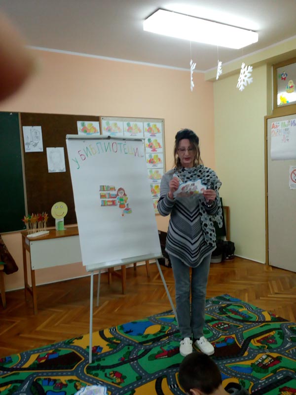 Фотографије активности васпитачице Оље Лазић: Први пут у библиотеци сведоче о пријатној радној атмосфери током извођења ове угледне активности. Библиотекарка Данијела je учествовала у реализацији једног дела ове занимљиве и успешне активности којој је присуствовала Душанка Маринковић, педагог.