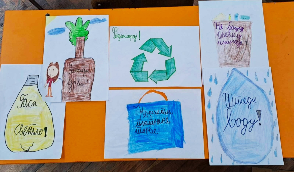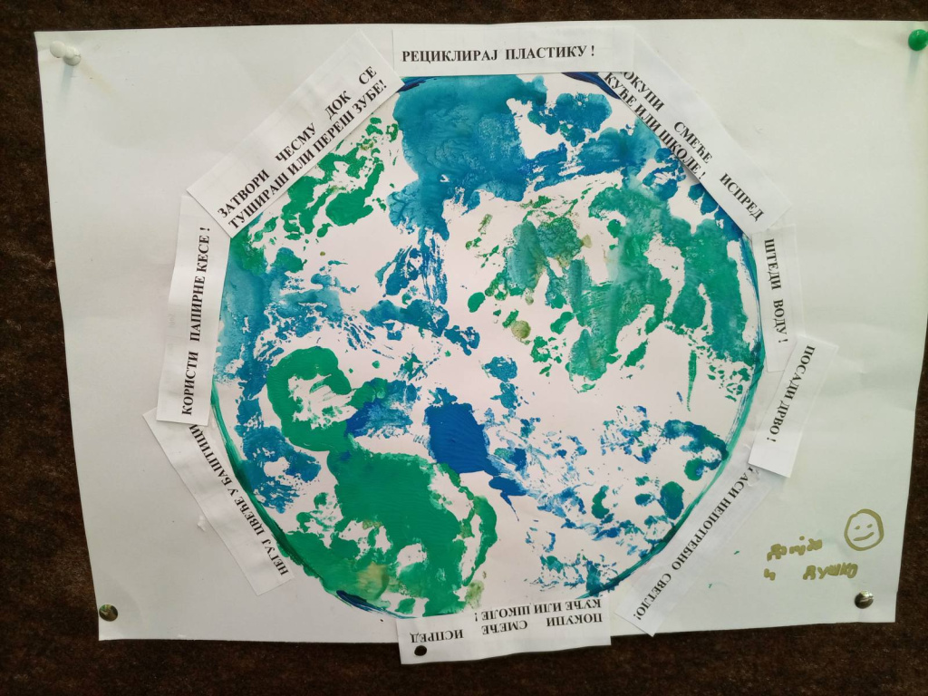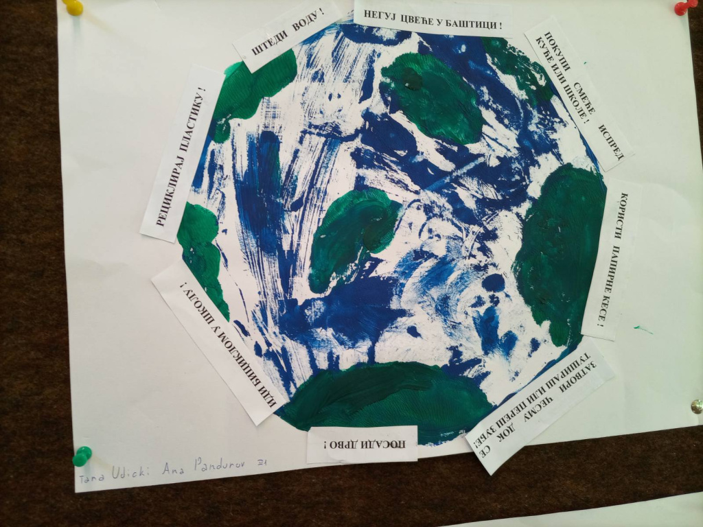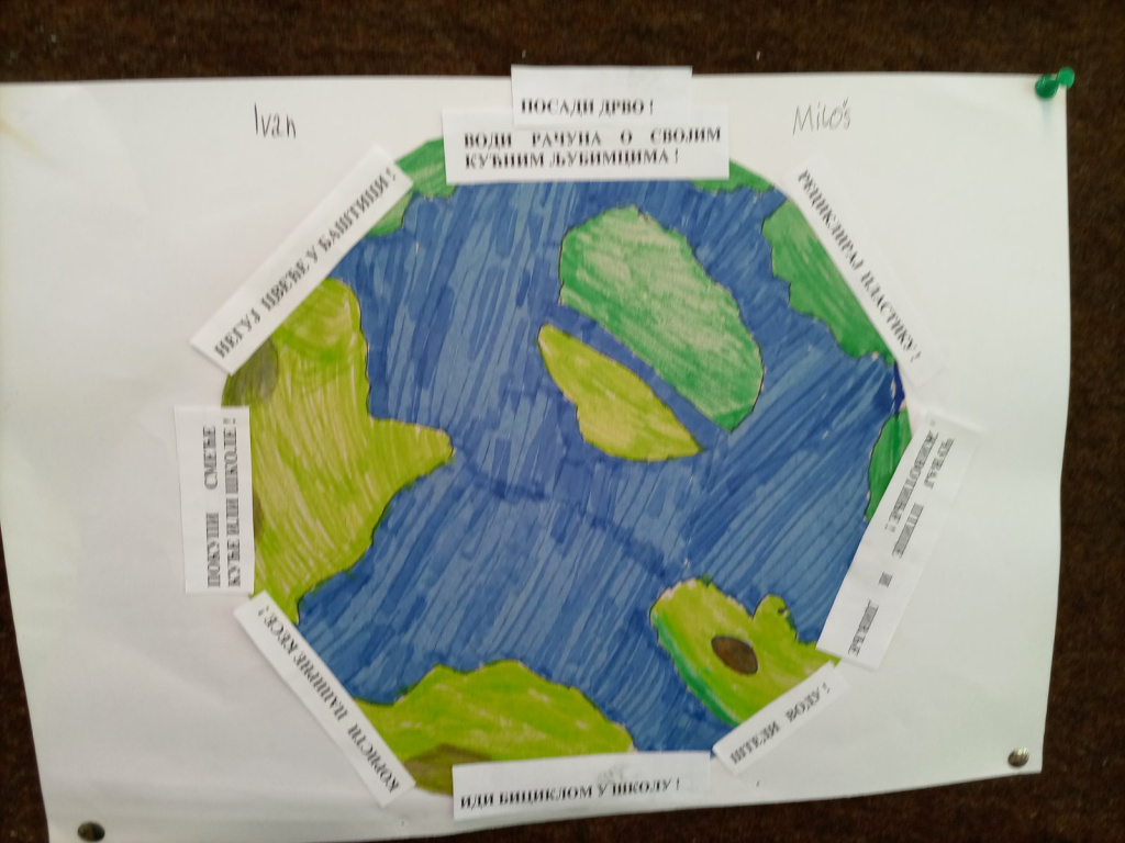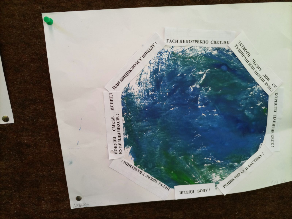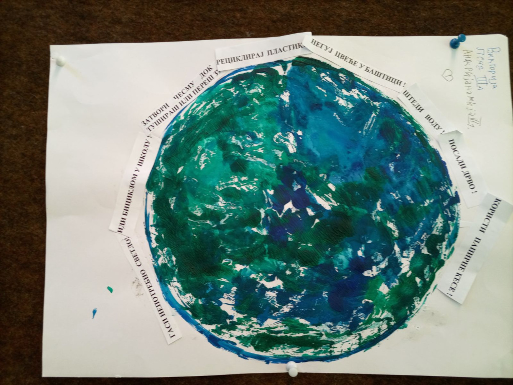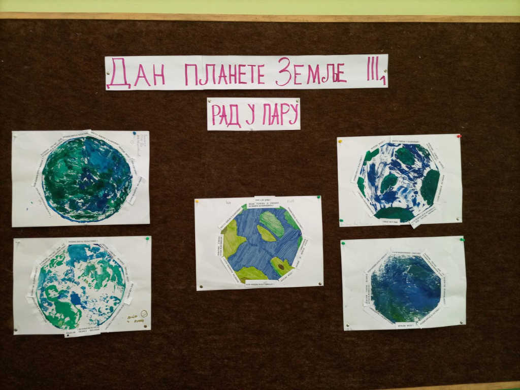 Ученици 3-1 су радили у пару користећи нову технику - отисак темпером , и на тај начин направили планету Земљу. Заједнички су осмислили реченице на тему: Како сачувати планету Земљу, а потом отштампане поруке и залепили.