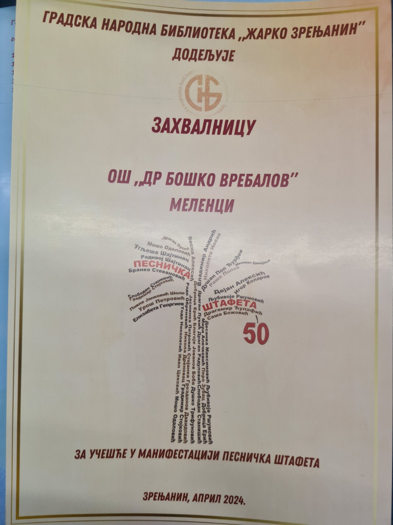 У понедељак, 8. априла је одржана Песничка штафета у нашој школи. Водитељ је био Урош Петровић који је  анимирао ученике да размишљају, откривају и радују се успеху у решавању проблема.