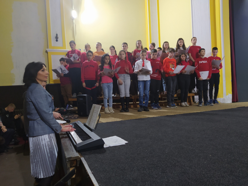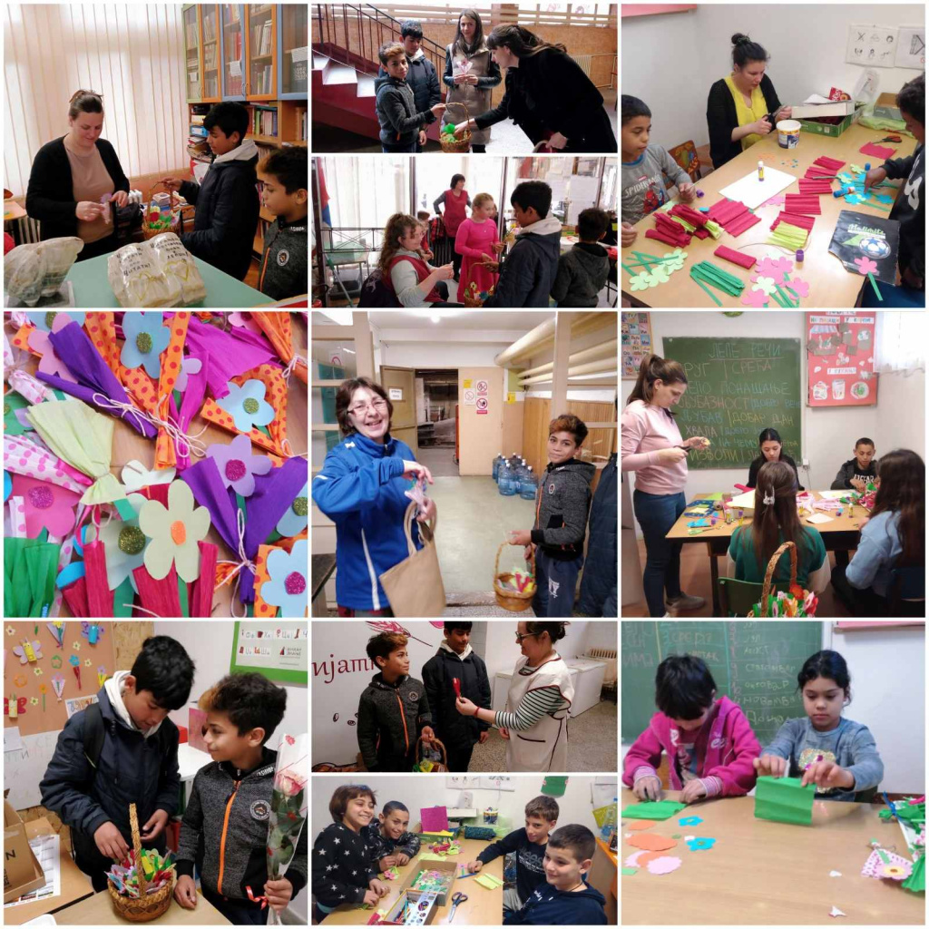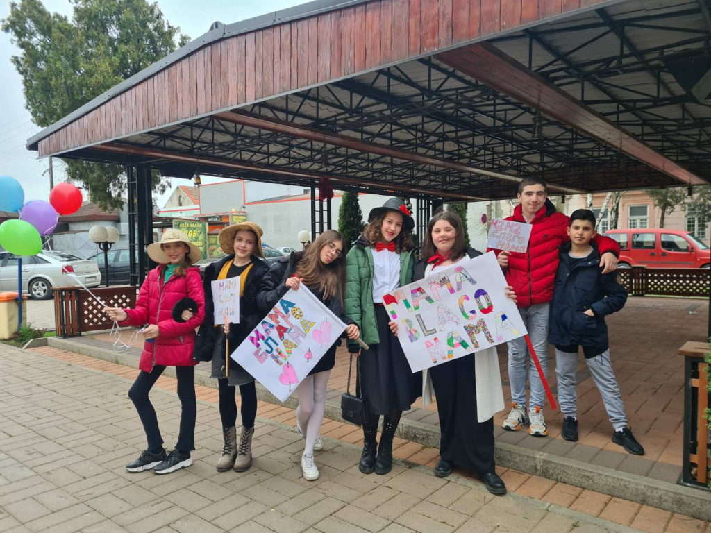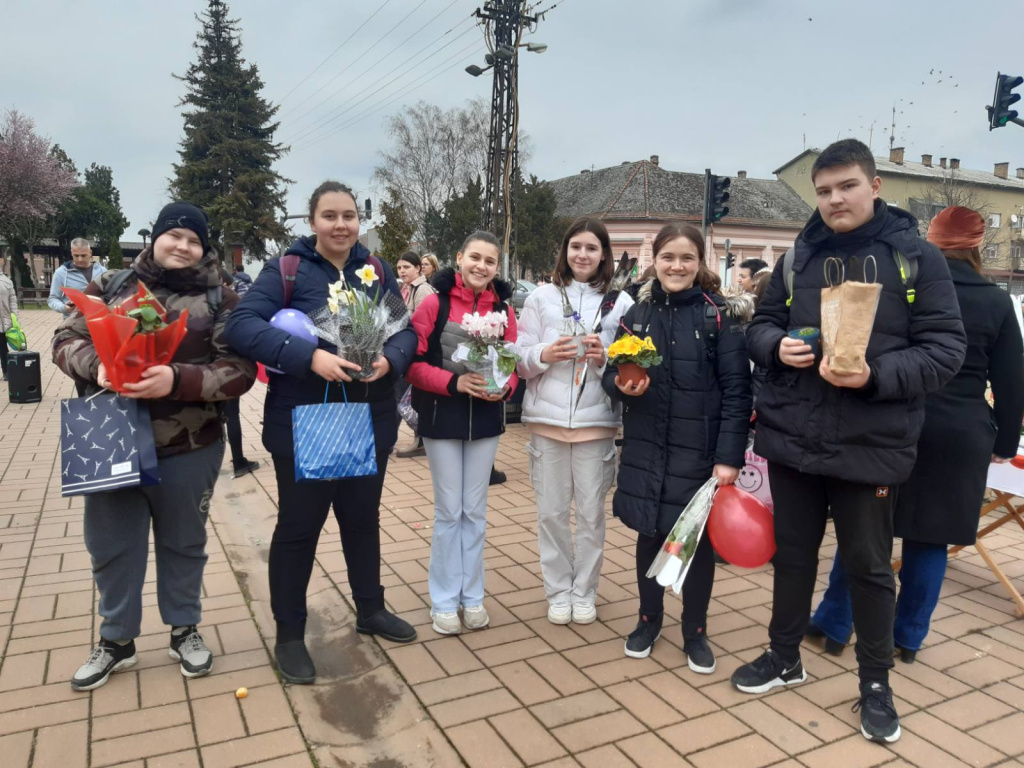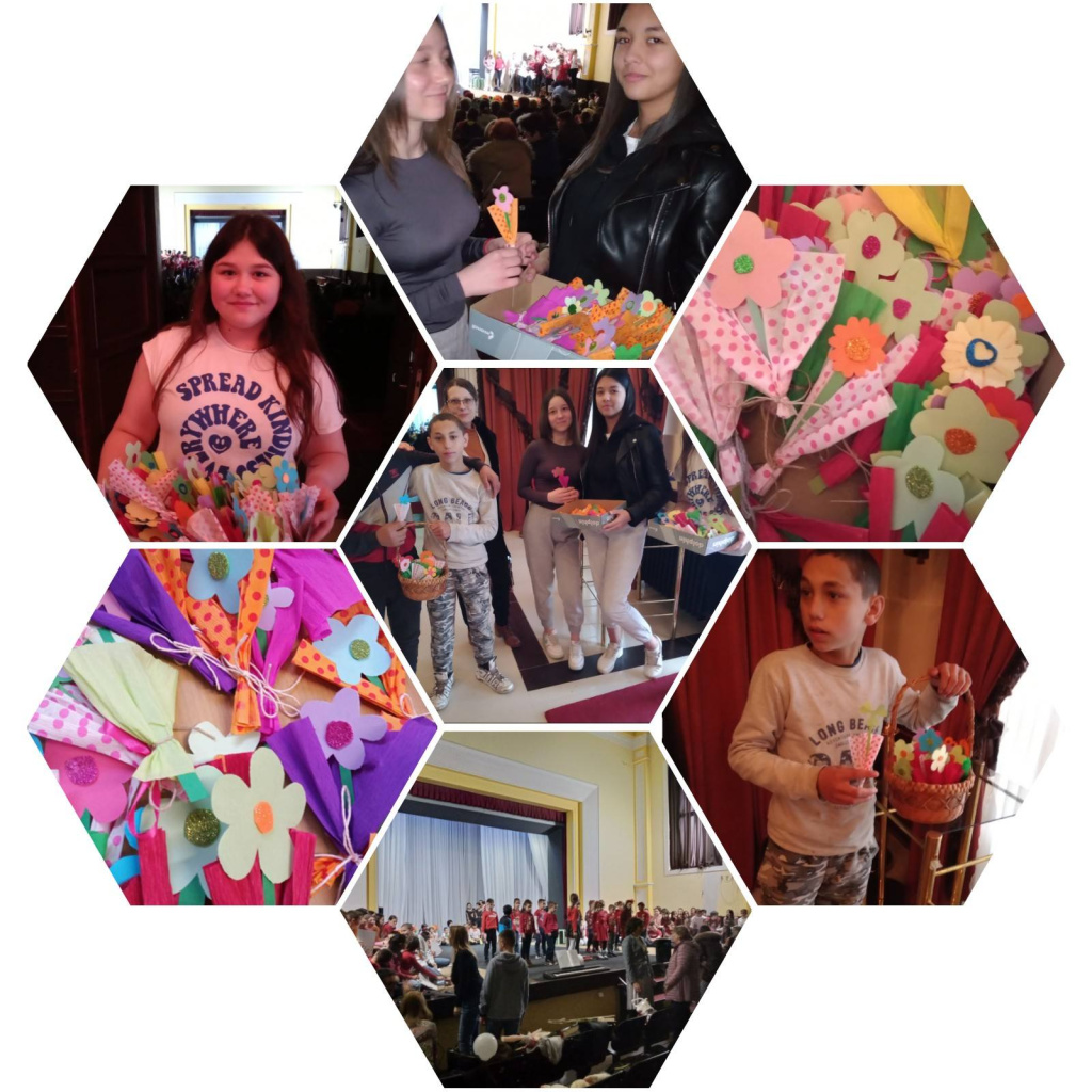 Ученици из подршке у Меленцима дају свој допринос на школској приредби, делећи цветове мамама, дамама, другарицама и наставницама.