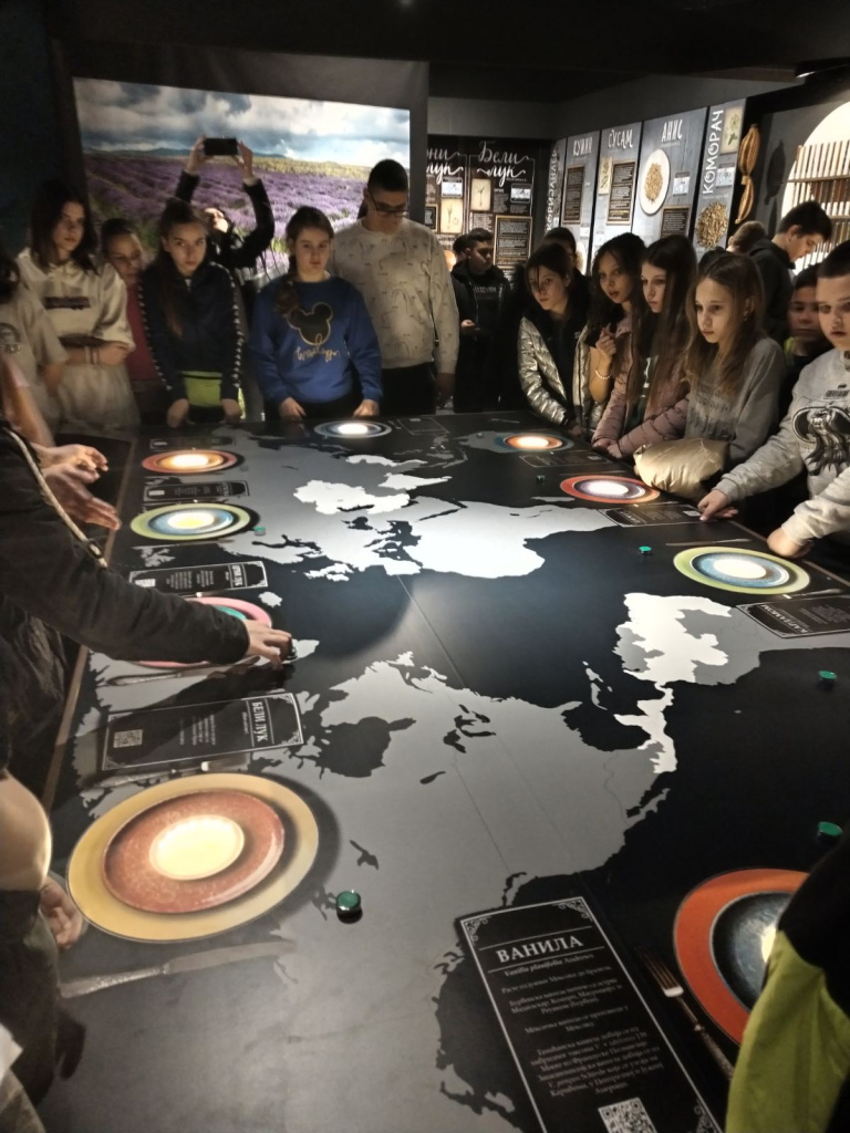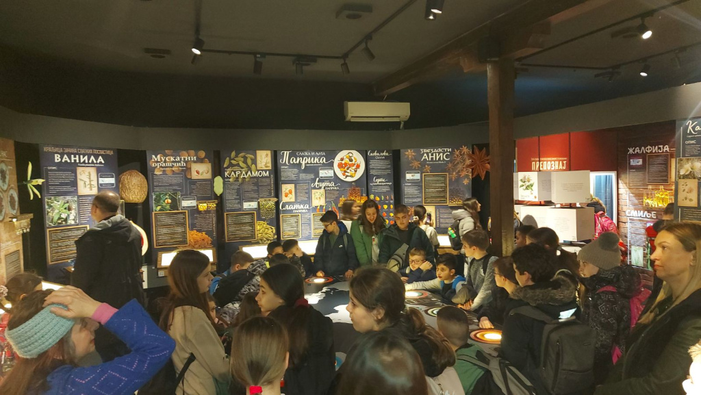 Након тога смо посетили “Природњачки музеј” где су ученици имали прилику да сазнају више о митовима, предањима и веровањима везаним за зачине, али и о њиховој кључној улози у гастрономији и производњи парфема. Маштовита поставка чији дизајн потписују Ања Марчетић и Биљана Совиљ, има нарочиту миришљаву и тактилну димензију, која омогућава посетиоцу да осети арому и структуру зачинских биљака, како оних егзотичних, тако и оних које расту на тлу наше земље.
